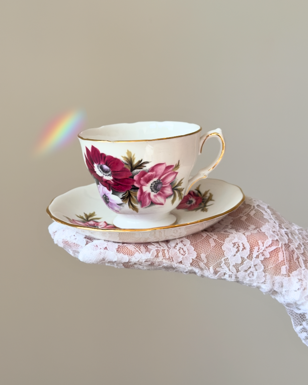 Son délicat motif d'anémones rehaussé d'un liseré doré, évoque toute la douceur des jardins anglais.