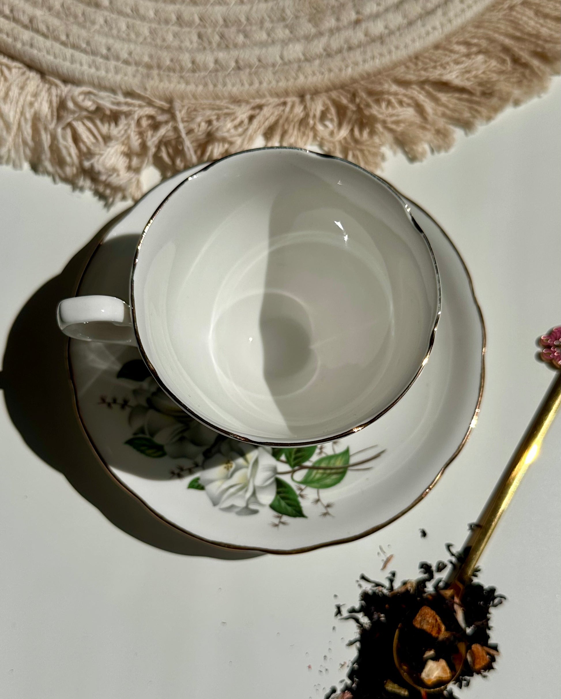 Sublimez votre Tea time avec le modèle Camellia de Royal Stafford, une tasse produite dans les années 1950.Ce motif floral délicat représente des fleurs blanches de camélia, symboles de pureté et d'élégance. Les fleurs sont peintes à la main avec des touches de dorure sur les bords, la base et la anse, ajoutant une note de luxe à chaque pièce!