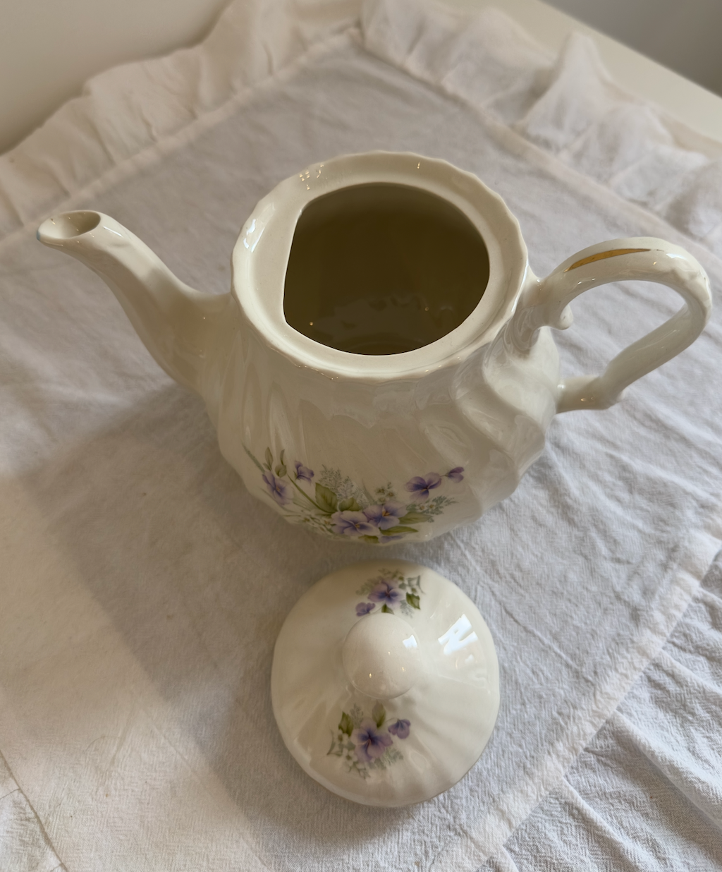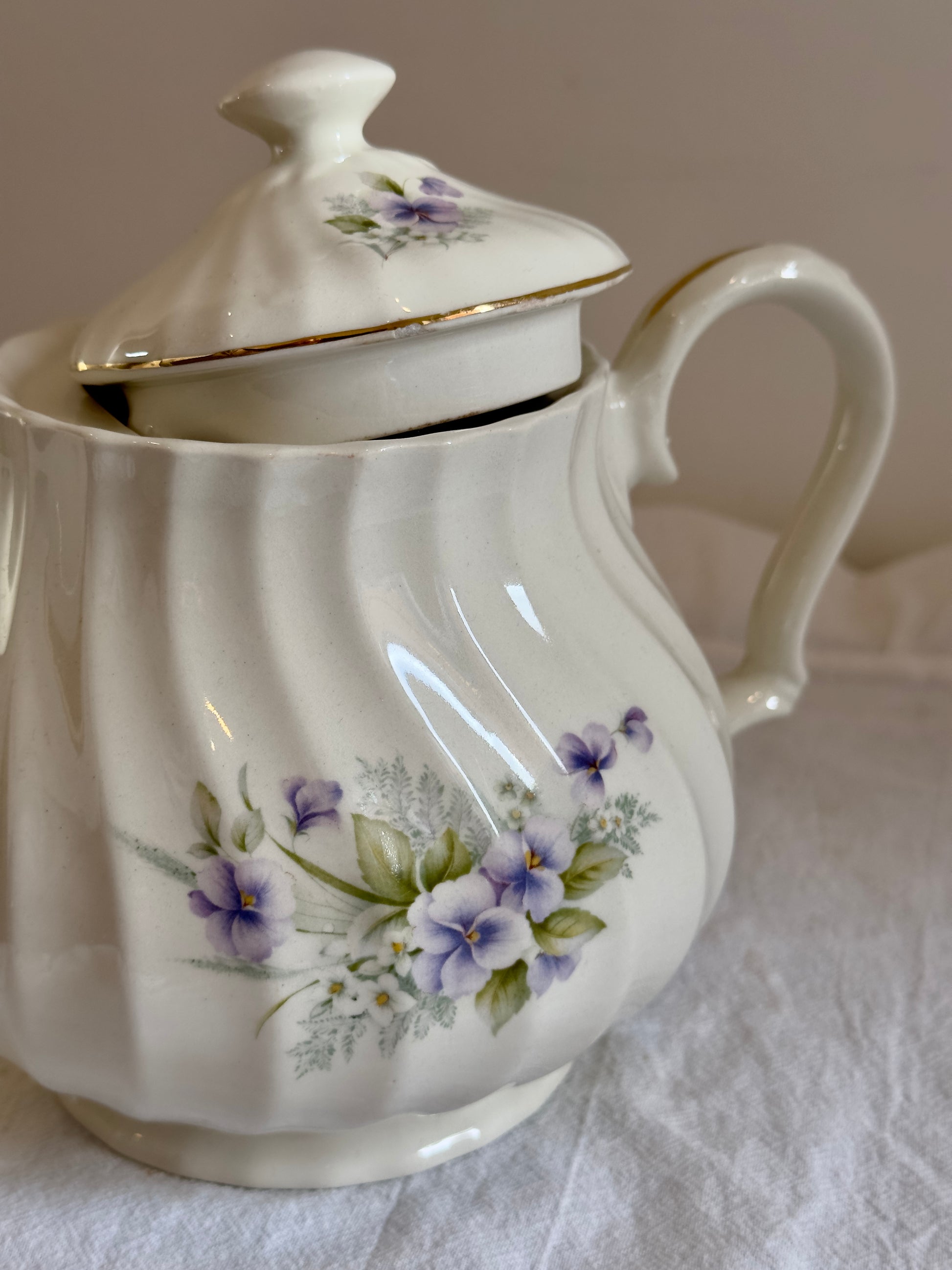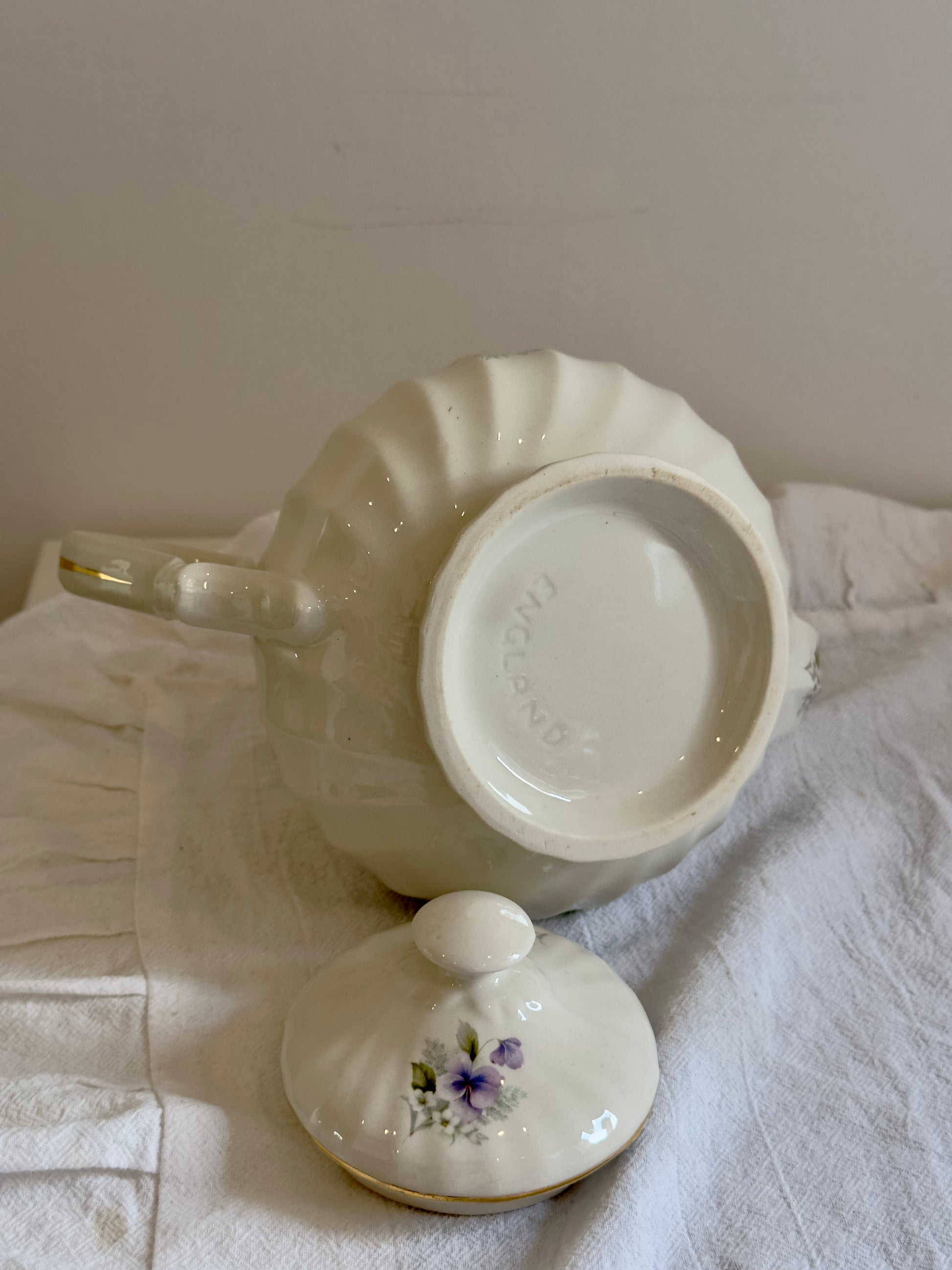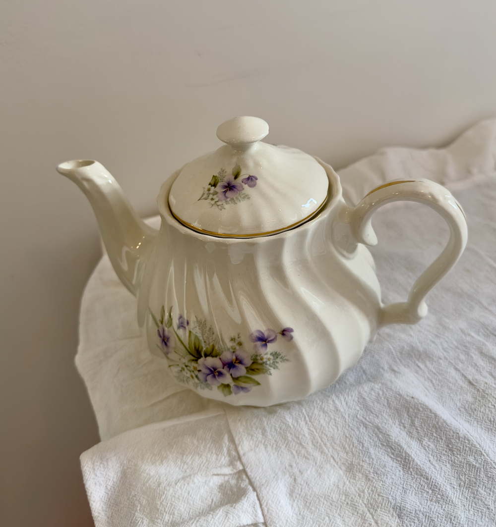 Laissez-vous séduire par cette ravissante théière Made in England en céramique, un modèle au charme unique grâce à sa moulure légèrement torsadée qui lui apporte relief, élégance et originalité. Avec son décor de fleurs violettes délicates, elle incarne parfaitement l’esthétique douce et romantique de la vaisselle anglaise traditionnelle.
