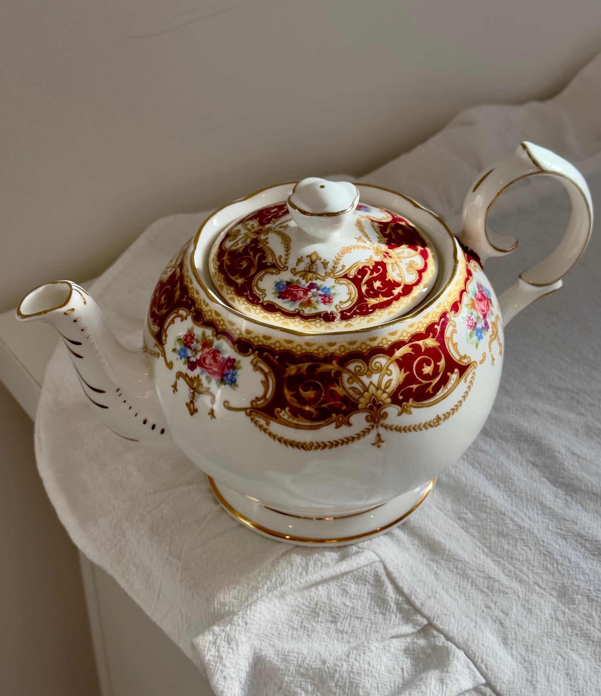 Apportez une touche d’élégance britannique à votre Tea time avec cette superbe théière Queen Anne, modèle Regency. Inspirée du style raffiné de l’époque Regency, cette théière se distingue par son bordeaux profond, ses délicates dorures et ses médaillons floraux finement ciselés, typiques de la vaisselle anglaise classique ✨
